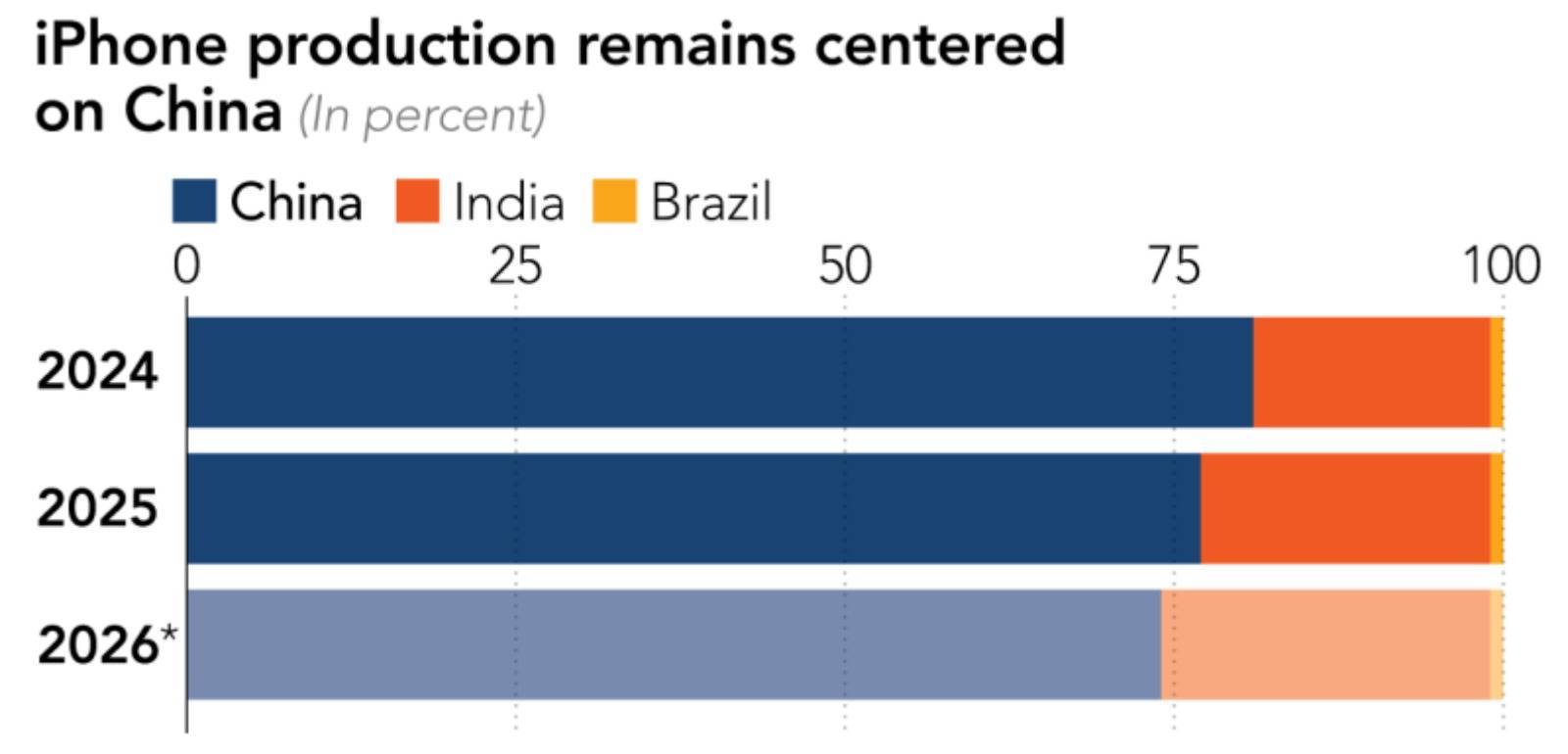 研究公司Counterpoint Research供应链分析师林科宇(Ivan Lam)告诉《日经亚洲》,截至2025年,大约22%的iPhone可能在印度组装,但这些产品主要销往美国市场。预计到2026年,这一份额将小幅上升至25%左右。